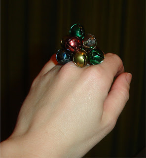 I aquired these vintage jingle bells a year or two ago and have not had the chance to use them....Until now! The package reads "1942" and they are in excellent condition except for the coloring on the Red, Green, and Blue (which is rubbing off). I used some brass wire that my mom gave me and made tonight's ring. I love the way jingle bells sound!.........
